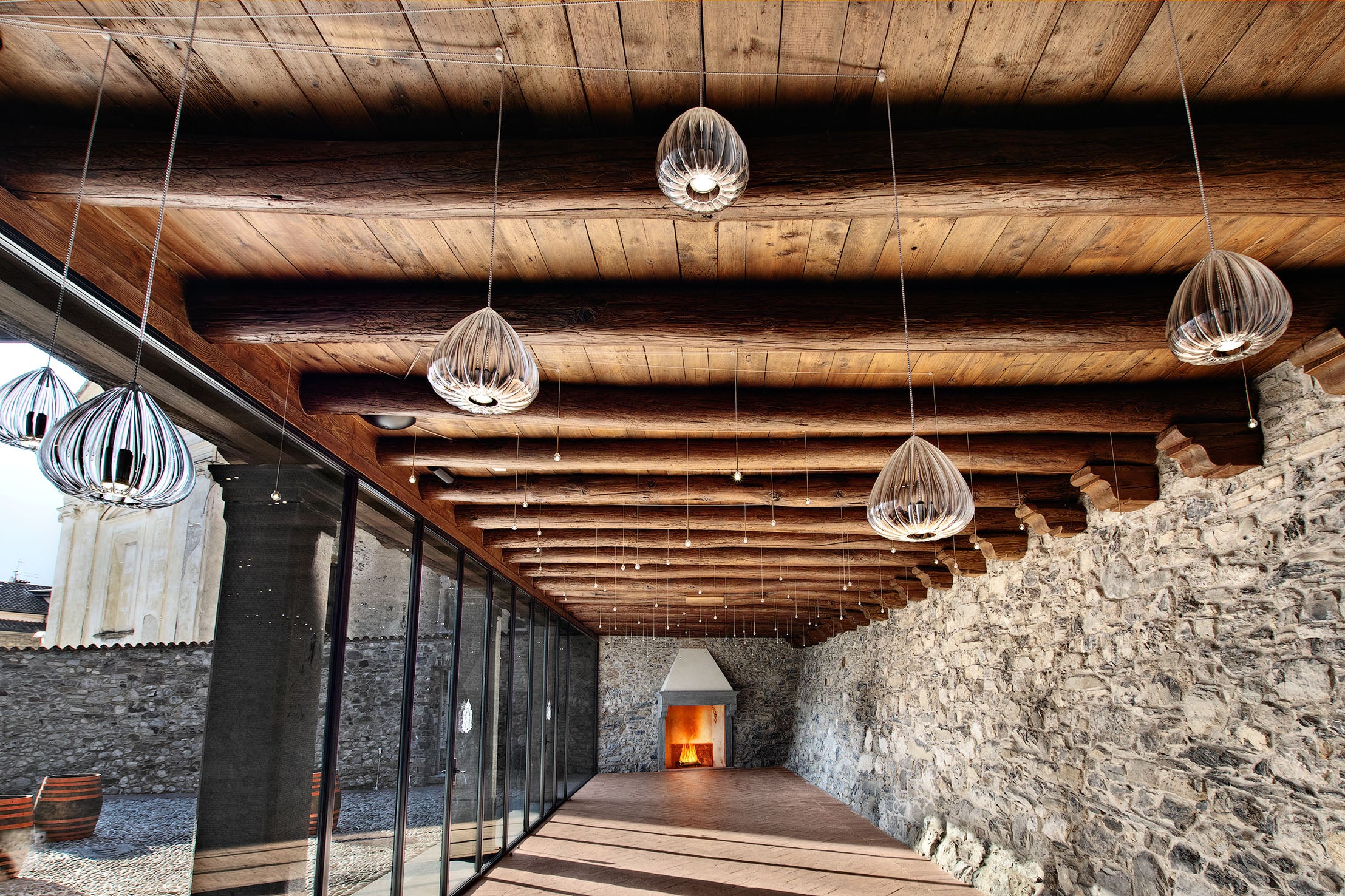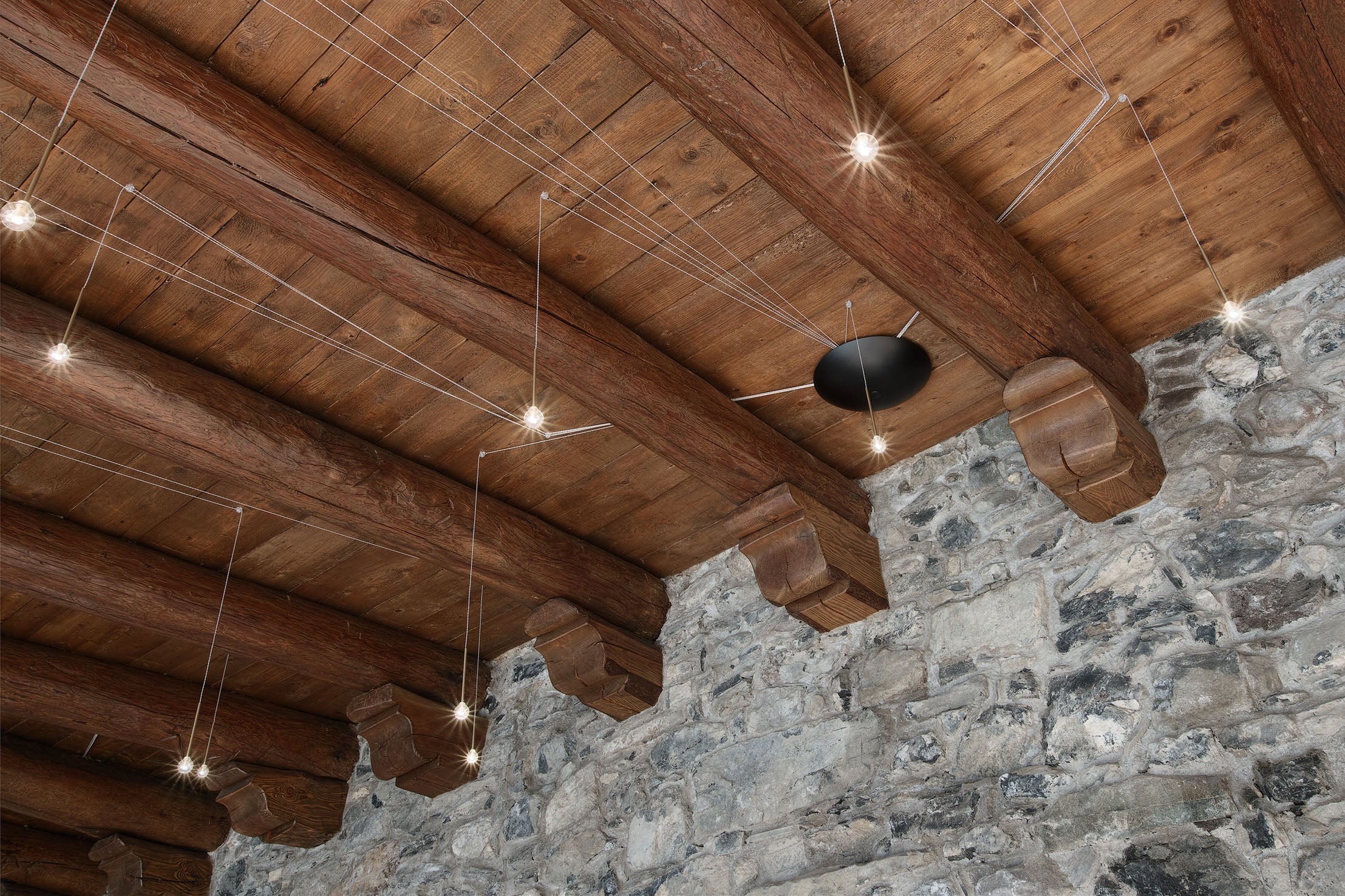 In this architectural renovation, our light doesn't just illuminate, it also embraces the soul of the village. A shower of small suspended stars falls from the ancient wooden beams, creating a visual bridge between the texture of the stone and the warmth of the fireplace. A suspended atmosphere, where every reflection on the terracotta tells a story of hospitality and attention to detail.