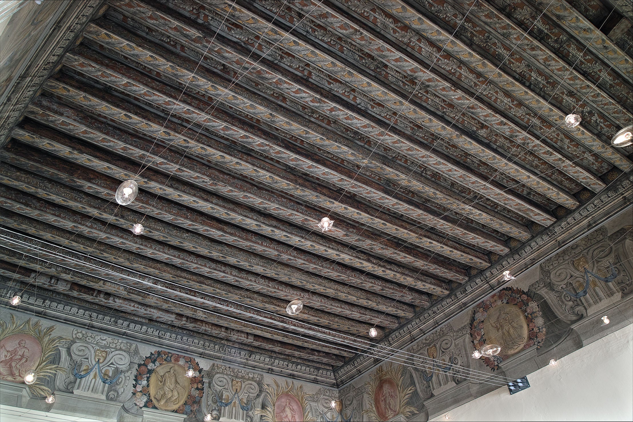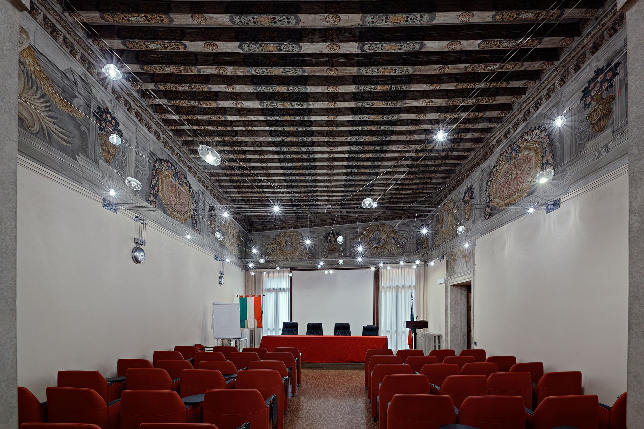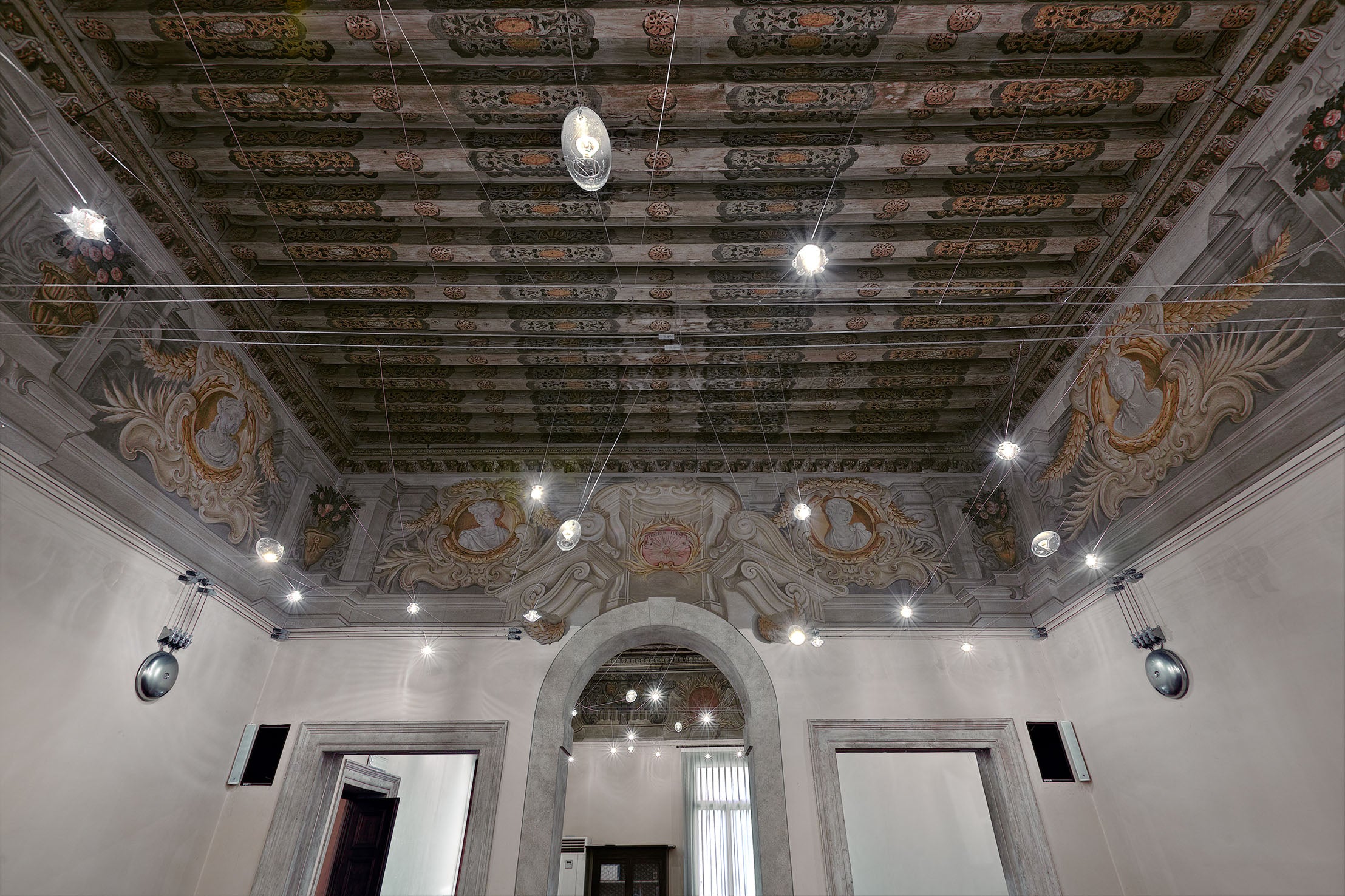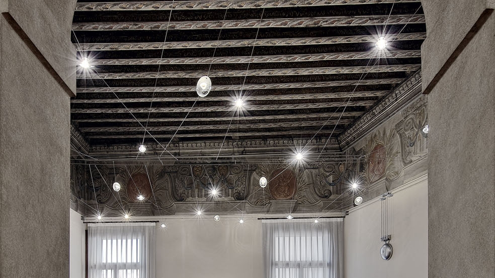 In this prestigious historical setting, the lighting was designed to enhance the solemnity of the rooms without interfering with the integrity of the frescoed walls. A lightweight cable system and point lighting create a technological "starry vault" that illuminates the room, allowing one to admire the richness of the friezes and coffered ceilings.